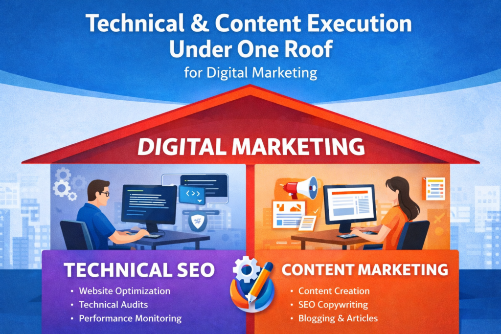 Many teams do strategy but do not execute. We handle technical fixes, page optimization, content writing, and design support—so implementation is fast and consistent.